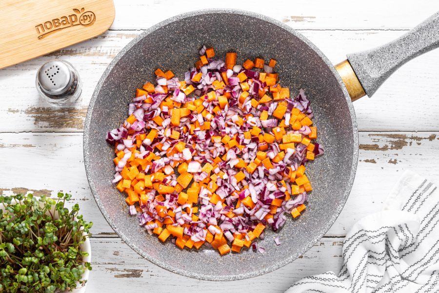 Разогрейте сковороду на среднем огне, обжарьте репчатый лук и морковь до золотистого цвета. Добавьте измельченный чеснок, жарьте еще секунду 20 до раскрытия аромата.