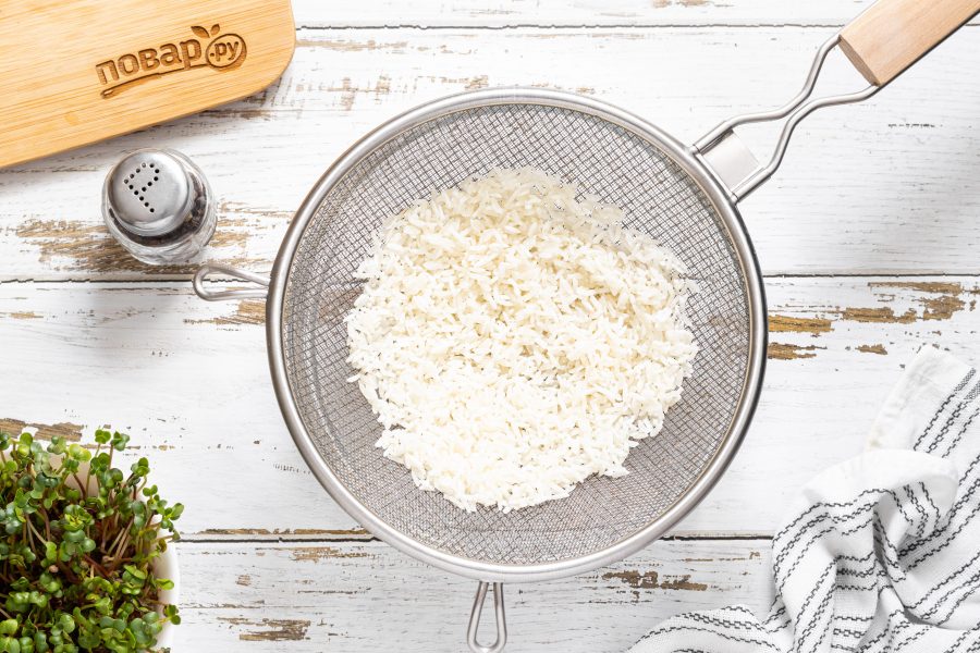 Рис промойте до прозрачности в воде несколько раз, затем откиньте на сито и дайте стечь лишней воде.