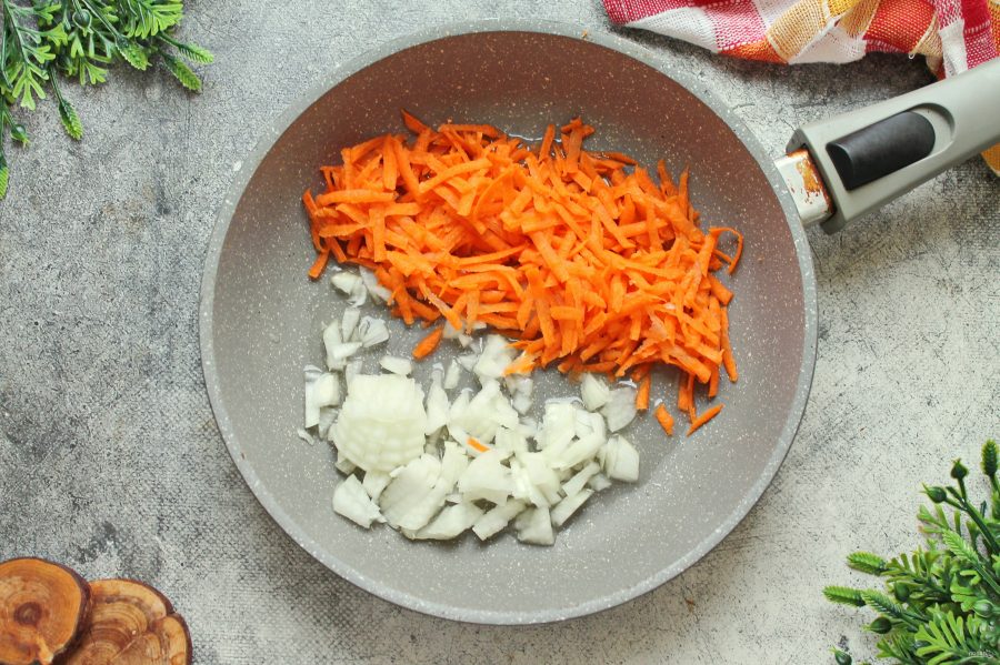 Морковь натрите на средней терке, выложите к репчатому луку и обжаривайте на среднем огне в течение 5-6 минут, до мягкости. Снимите сковороду с огня и полностью остудите.