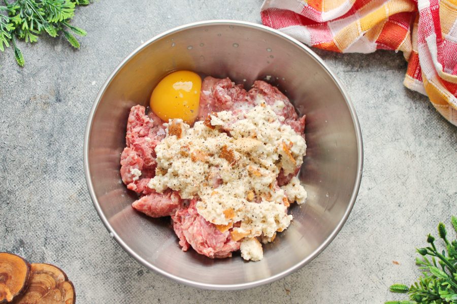 Замоченную булку вместе с молоком выложите в миску с фаршем. Все посолите и поперчите.