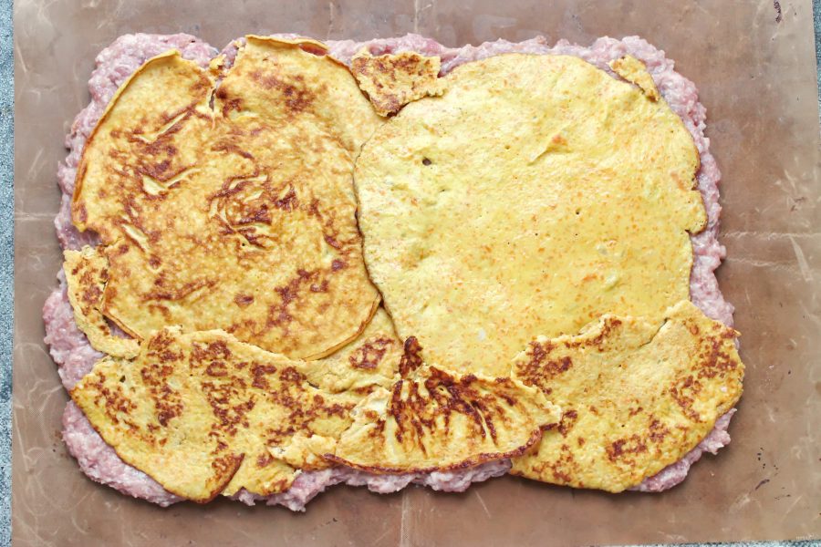 На противень постелите пергамент или коврик для запекания и выложите фарш. Распределите его в пласт толщиной 5-7 мм. Сверху распределите блины.
