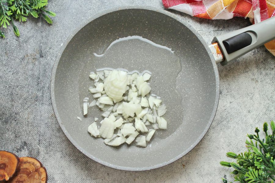 Репчатый лук мелко порежьте и выложите в сковороду с разогретым растительным маслом.