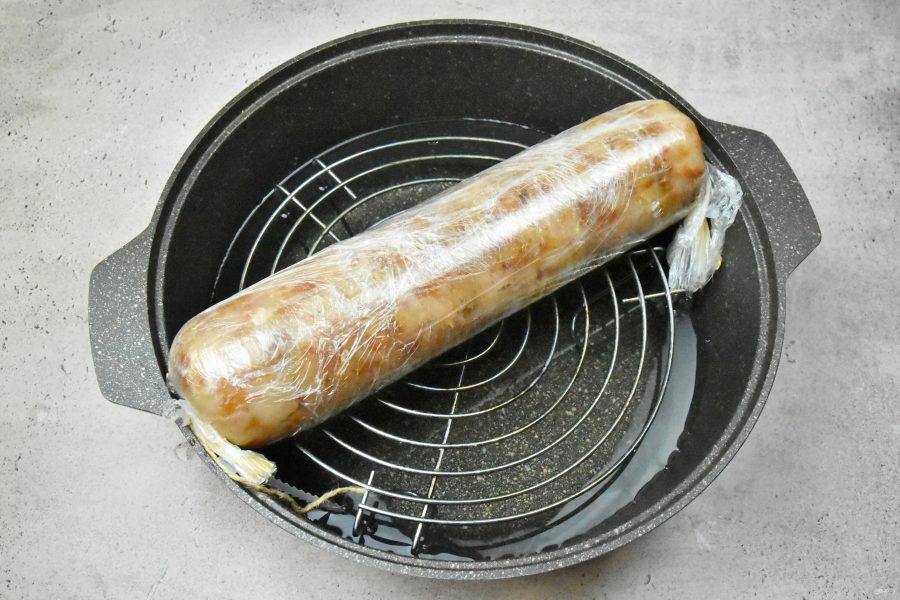 Рулет можно запечь в духовке или отварить. Перед запеканием оберните полуфабрикат несколькими слоями фольги. Перед отвариванием дополнительно можно завернуть рулет в несколько слоев пищевой пленки.