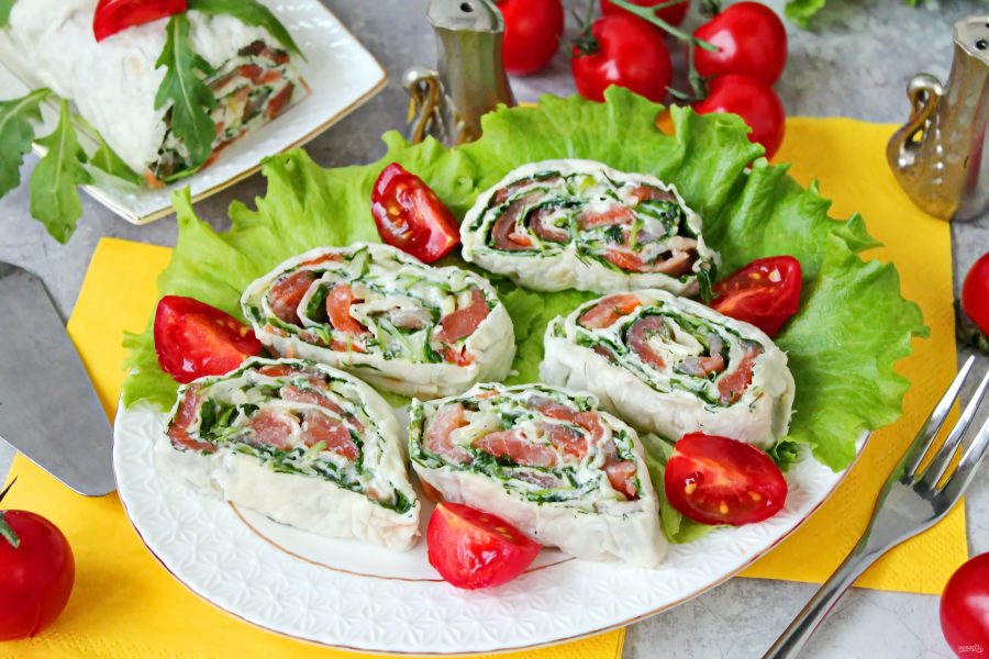 Рулет из лаваша с рыбой готов. Приятного аппетита!