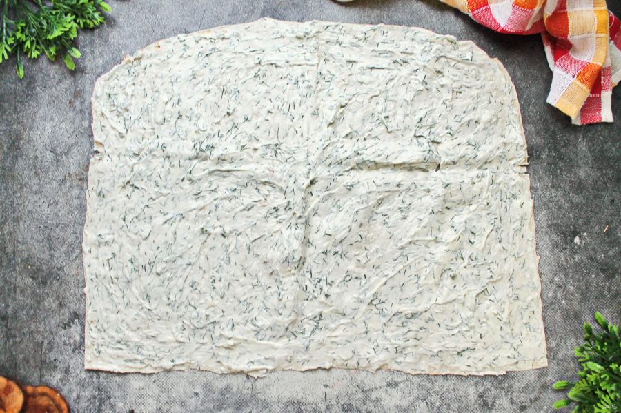 Тонкий лаваш разверните и один край выровните. Смажьте всю поверхность подготовленной творожной массой.