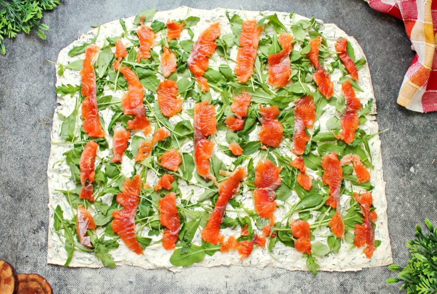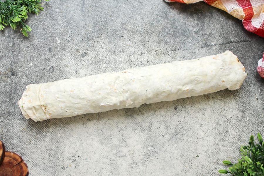 Сверните лаваш в плотный рулет. Заверните его в пленку или в фольгу и уберите в холодильник на 30 минут. После этого разрежьте рулет с рыбой на куски и подавайте к столу.