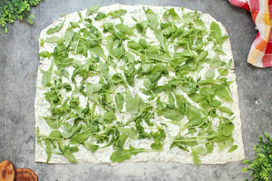 Разложите по поверхности листовой салат, у меня руккола.