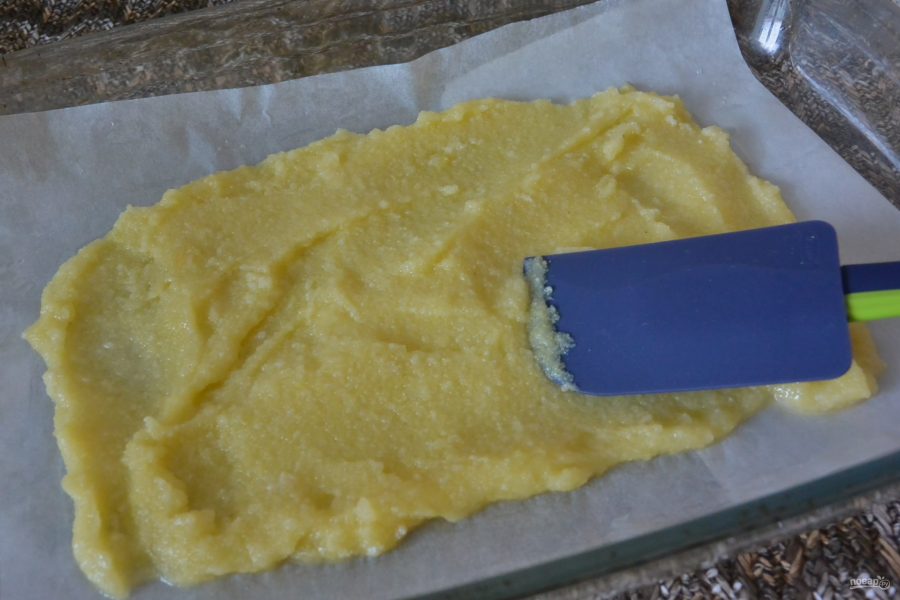 Сварить поленту в течение 3 минут, добавив сливочное масло и выложить тонким слоем сваренную поленту на пергамент. Выпекать в духовке на среднем огне 25 минут.
