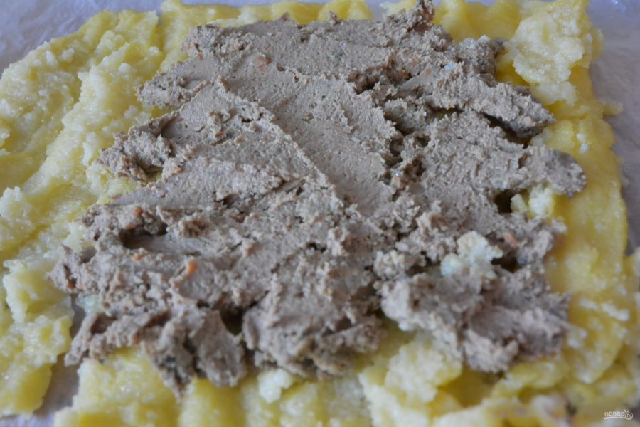 Я приготовила сначала печёночный паштет, потом сделала из него начинку для рулета из поленты.