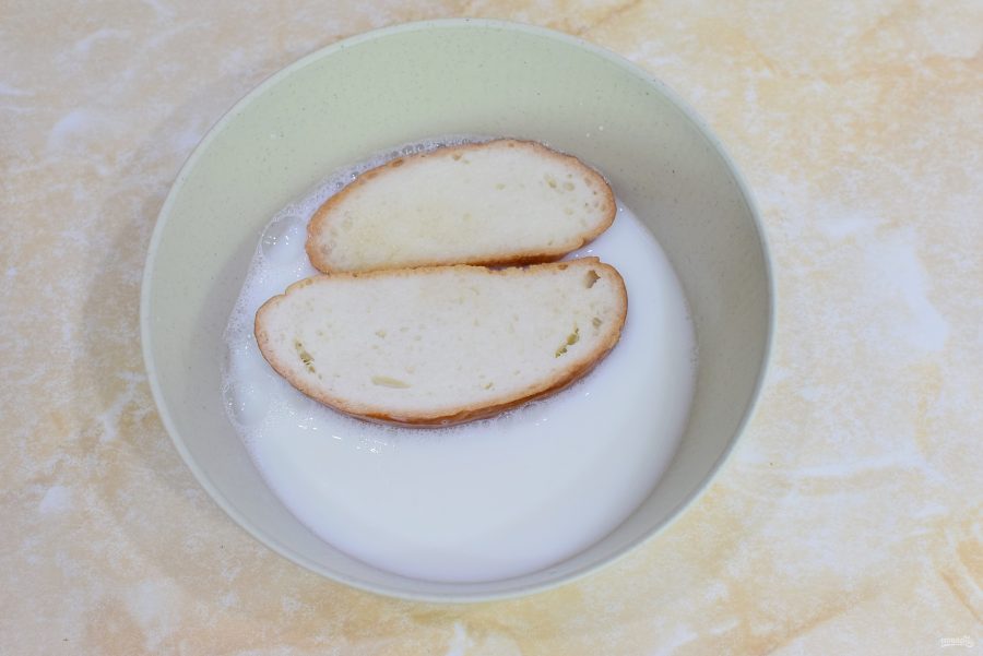 Батон замочите в молоке и оставьте на 2-3 минуты.