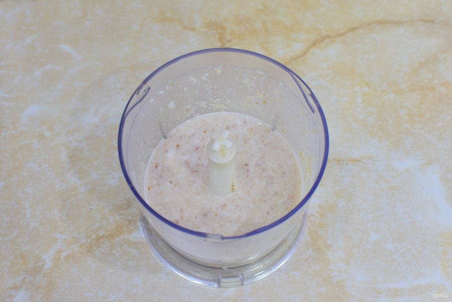 Затем батон немного отожмите от молока и измельчите в однородную массу.