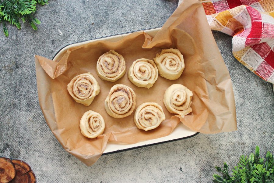 Противень застелите пергаментом и смажьте немного сливочным маслом. Тесто сверните в рулет, защипните срез и разрежьте его на части толщиной 4 сантиметра. Выложите куски рулета разрезом вверх. Накройте противень и оставьте рулетики для подъема в теплом месте на 30-40 минут.