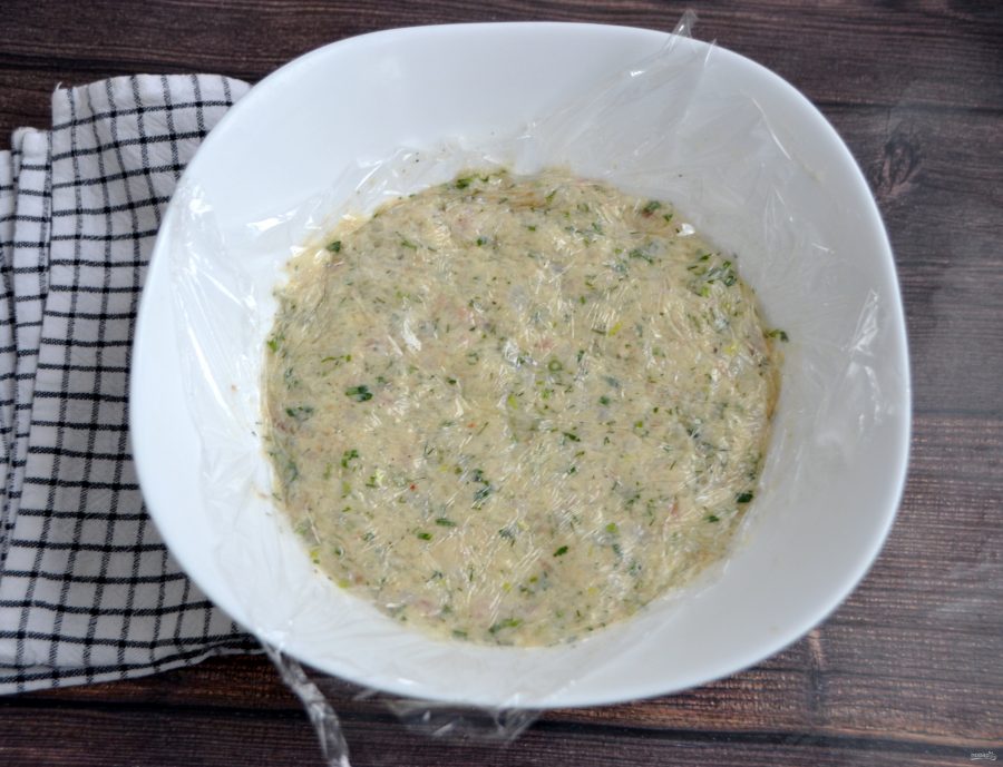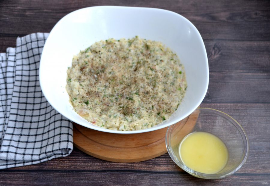 Смешайте всю массу и добавьте растопленное сливочное масло. Посолите, поперчите и хорошо помните руками.