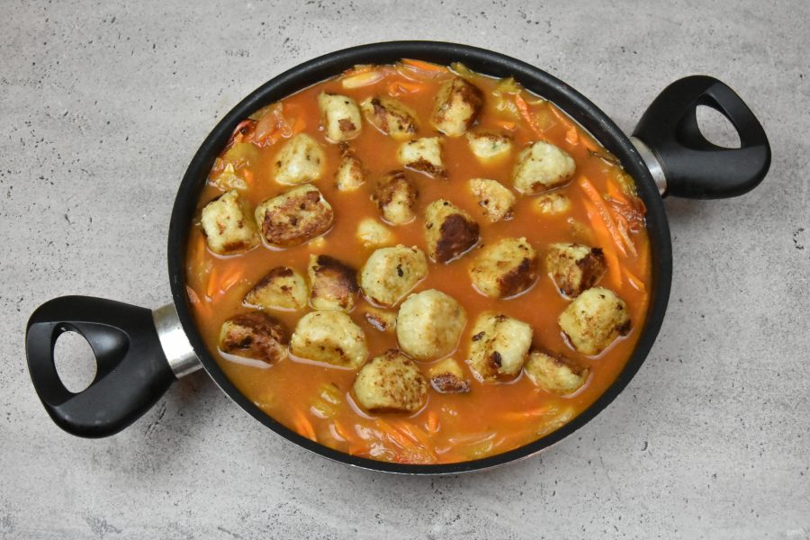 Переложите в овощной соус отложенные рыбные фрикадельки, накройте посуду крышкой и потушите на медленном огне минут 20.