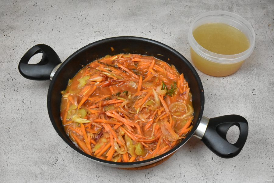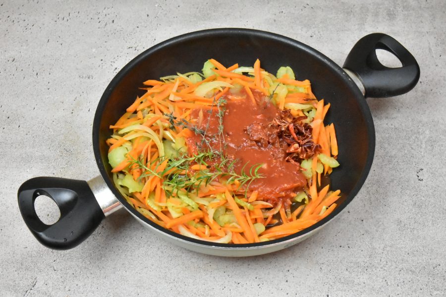 В сковороду, где обжаривались польпетте влейте по необходимости оливковое масло и переложите овощи. Добавьте веточки тимьяна и розмарина и пассеруйте до мягкости и прозрачности лука.