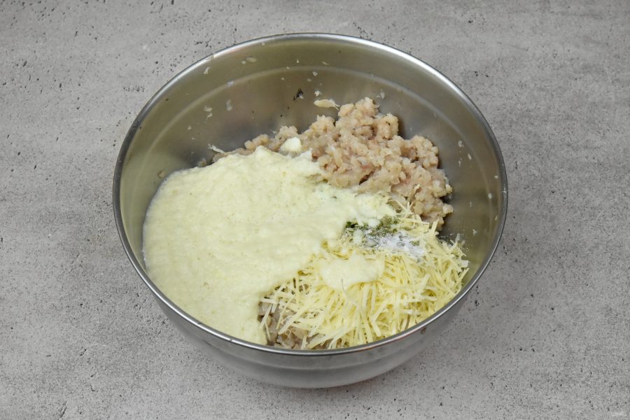 Соедините в миске подходящего размера рыбный фарш, тертый пармезан. Добавьте кукурузный крахмал, специи, соль и сухие травки.
