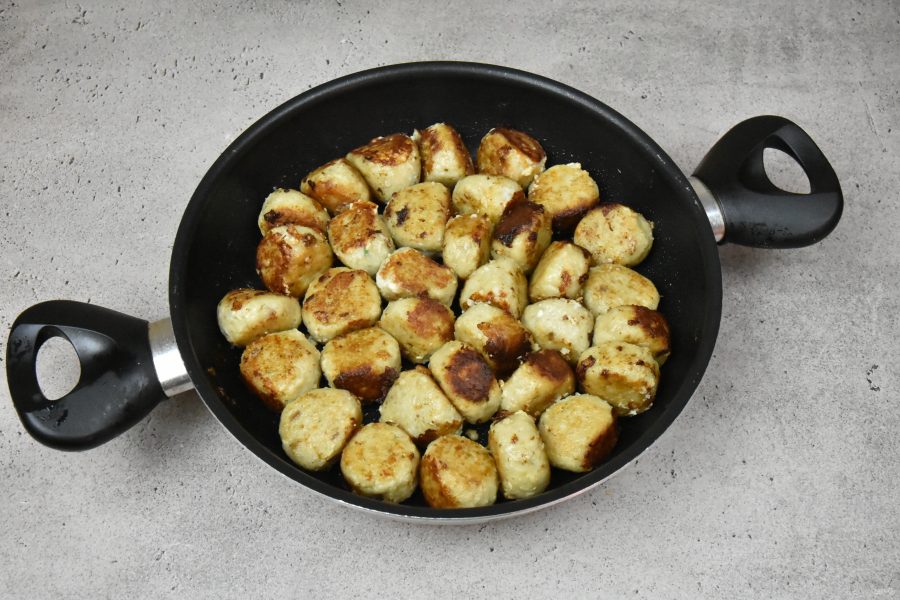 В сковороде разогрейте оливковое масло на среднем огне и обжарьте рыбные фрикадельки до подрумянивания со всех сторон. Переложите готовые польпетте со сковороды на блюдо.
