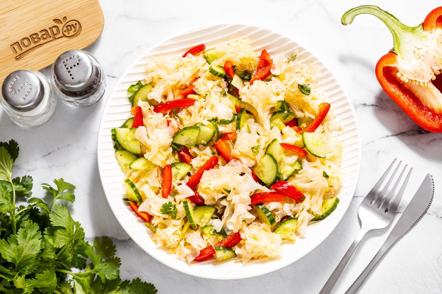 Ниже я расскажу подробнее, как приготовить салат из ледяного гриба. Вместо перцового масла для пикантности можно добавить молотый перец или свежий чили мелко порубленный. Кинзу можно заменить на петрушку или зеленый лук. Гриб имеет интересную хрустящую и упругую текстуру. Предлагаю приготовить овощной салат с ледяным грибом в азиатском стиле. Он получается пикантным, сочным и очень вкусным!Состав / Ингредиенты: