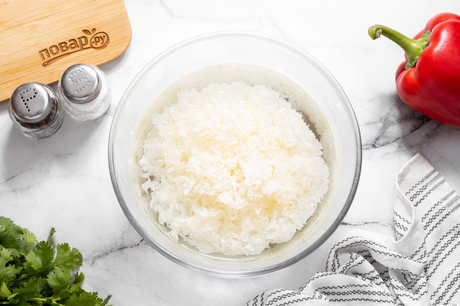 Сухой ледяной гриб замочите в горячей воде на полчаса или час, пока он полностью не размокнет, станет мягким, пластичным.