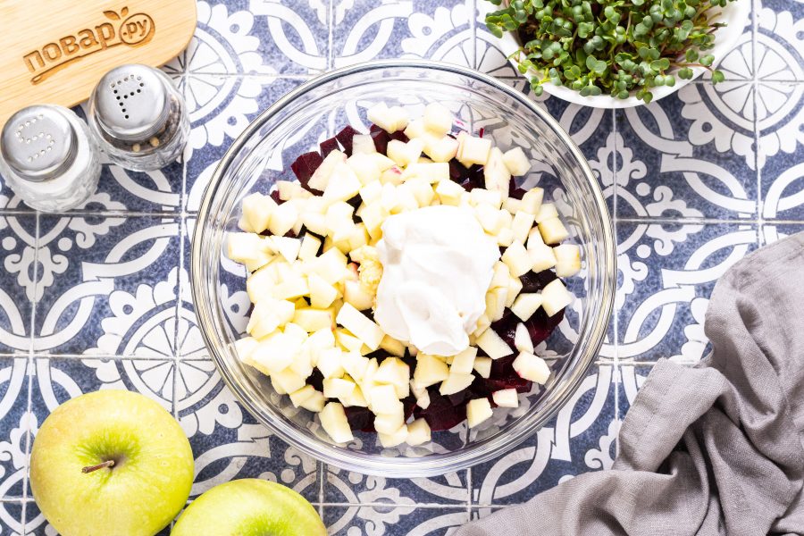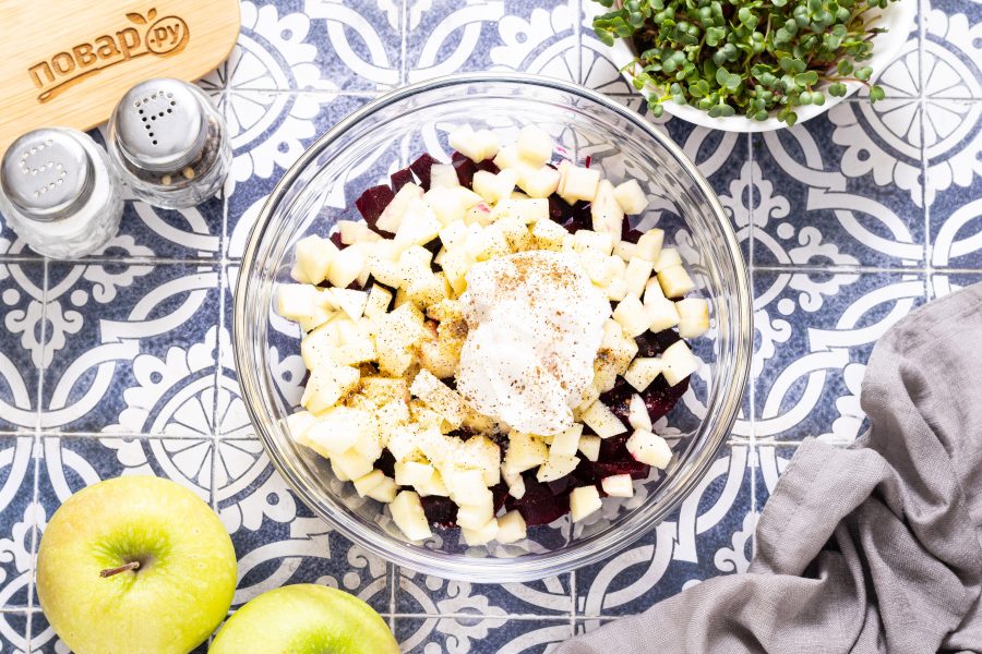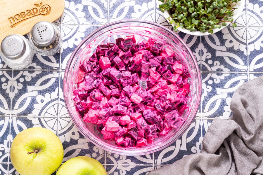 Для подачи можно мелко порубить орехи (миндаль, грецкие или кедровые) и посыпать ими салат. Салат из свеклы и яблок готов, приятного вам аппетита!