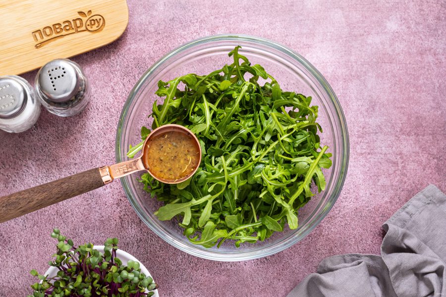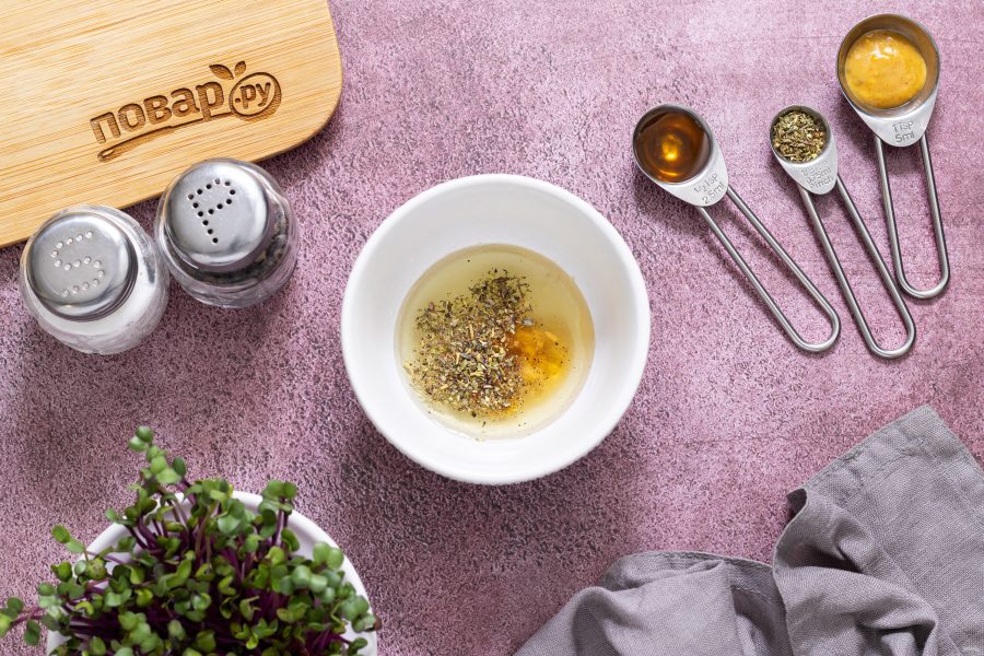 Для заправки смешайте оливковое масло с лимоном соком, медом и дижонской горчицей. Добавьте молотый перец, сушеные итальянские травы и соль.