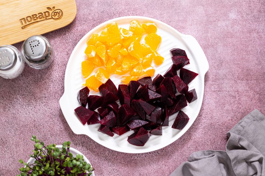 Свеклу очистите от кожуры, нарежьте на ломтики среднего размера. Мандарин очистите. Разделите на дольки, затем каждую дольку тоже разрежьте на 2-3 части.
