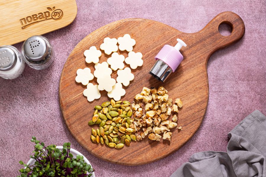 Грецкие орехи и тыквенные семечки обжарьте до легкого золотистого цвета. После крупно порубите грецкие орехи. С помощью формы для канапе вырежьте из ломтика сыра цветочки. Если такой формы нет, то просто нарежьте сыр на кубики небольшого размера.