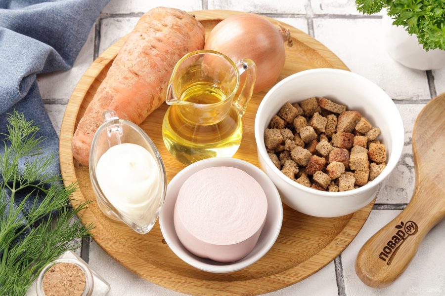 Подготовьте все ингредиенты по списку. Колбасу можно использовать как копченую, так и вареную. Сухарики подойдут любые, а если есть время, то приготовьте их самостоятельно.