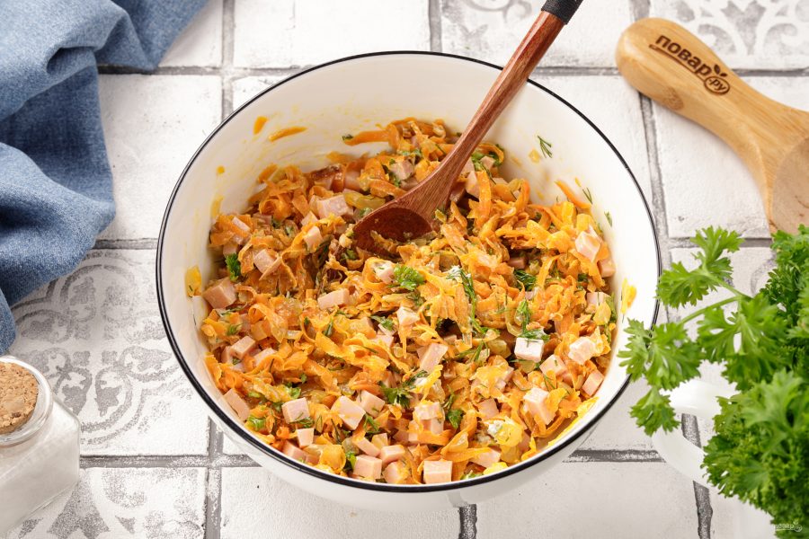 Салат «Обжорка» с колбасой готов. Приятного аппетита!