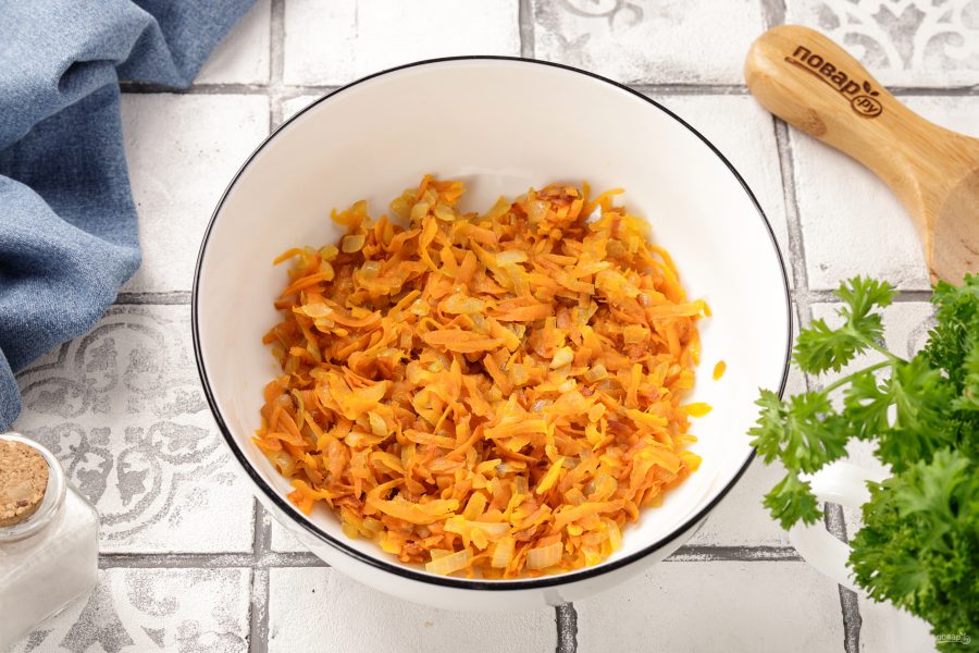 Лук нарежьте кубиками, а морковь натрите на тёрке. Выложите овощи на разогретую сковороду с маслом.