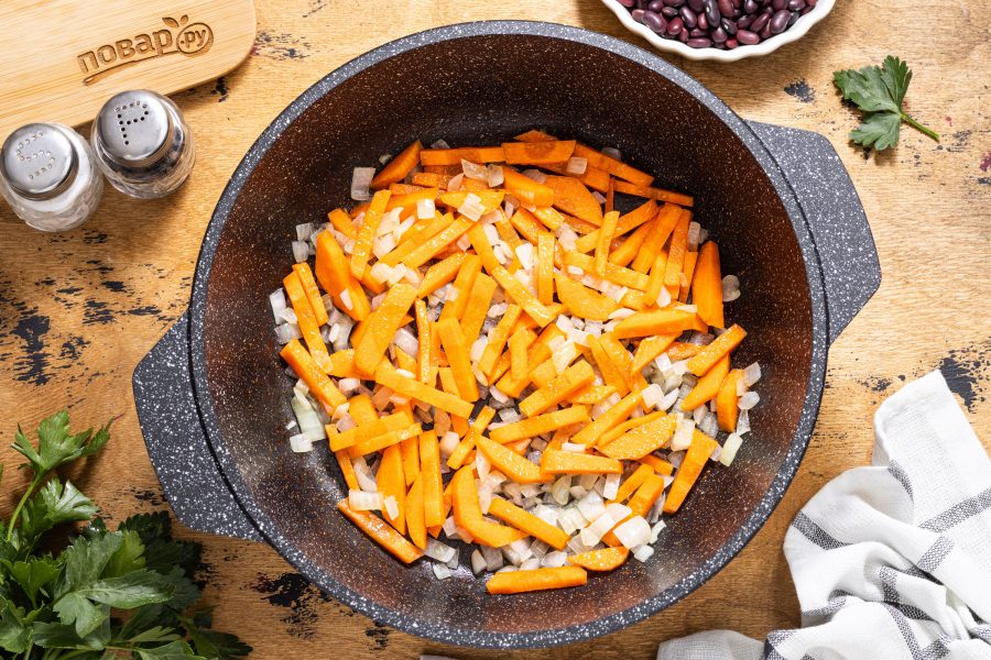 Разогрейте кастрюлю с толстым дном или глубокую сковороду на среднем огне. Обжарьте немного с растительным маслом репчатый лук, затем добавьте к нему морковь. Жарьте до мягкости и золотистого цвета.