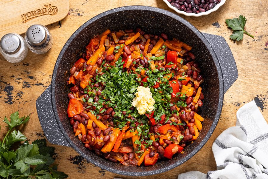 Петрушку мелко порубите, чеснок очистите и пропустите через пресс. Добавьте петрушку и чеснок к фасоли. Влейте уксус и готовьте еще 5 минут на умеренном огне.
