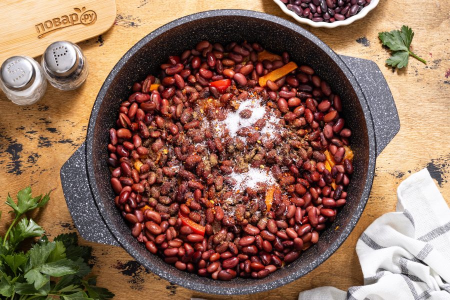 Добавьте фасоль. Посолите, добавьте все специи и сахар. Тушите фасоль 20-30 минут до мягкости.