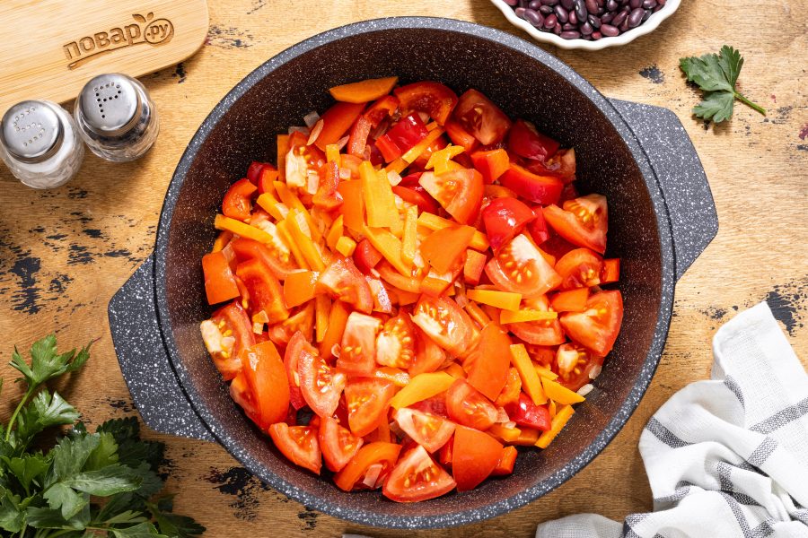 Добавьте болгарский перец и обжаривайте пару минут, помешивая. После добавьте помидоры. Тушите, пока они не пустят сок и не станут мягкими.