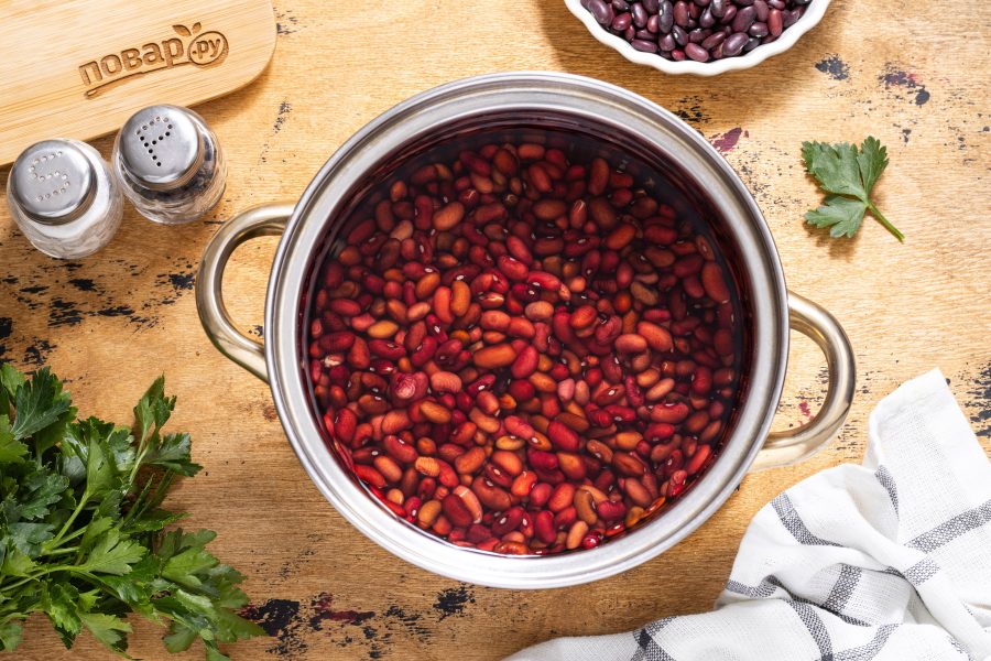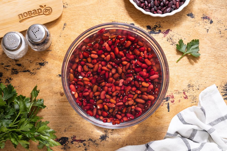 Фасоль предварительно замочите в воде на 8-10 часов. Можно оставить на ночь.