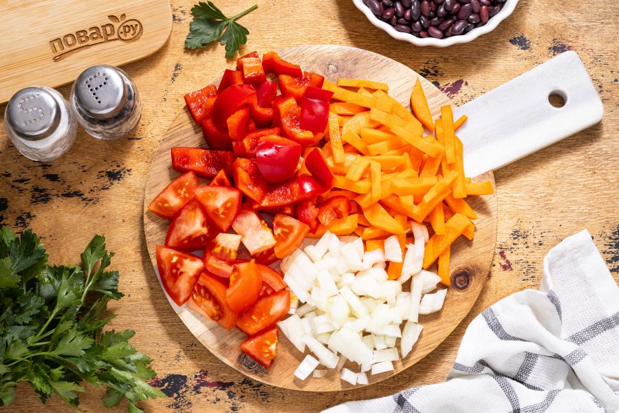 Репчатый лук нарежьте кубиками, а помидоры и болгарский перец ломтиками среднего размера. Морковь очистите от кожуры, нарежьте соломкой или брусочками.