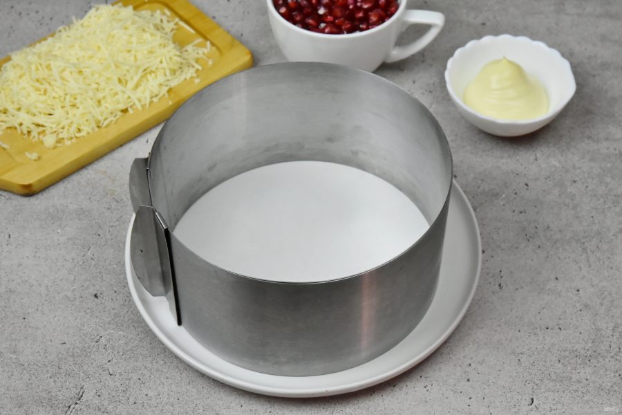 Украсьте верх салата зернами граната, равномерно распределив их по всей поверхности. Охладите салат в холодильнике. Перед подачей удалите аккуратно сервировочное кольцо и украсьте по желанию.