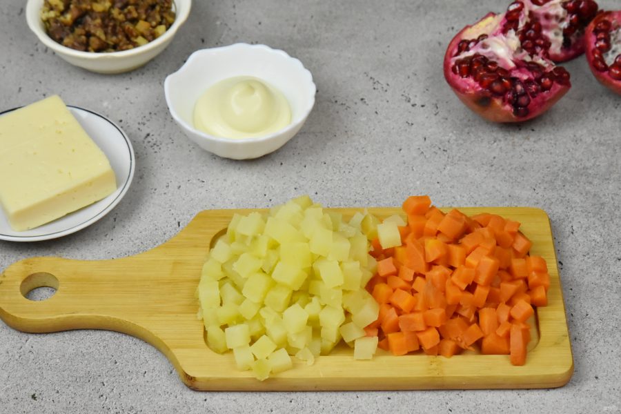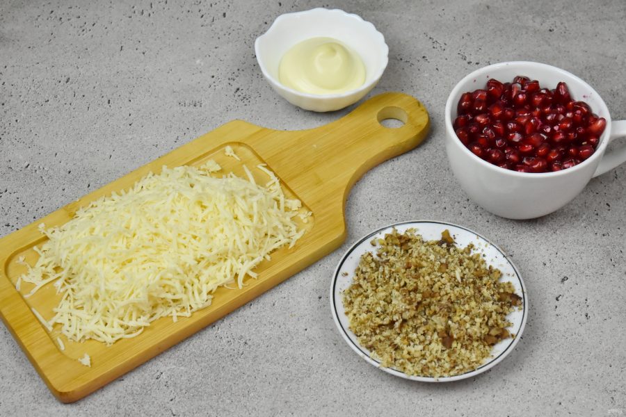 Сыр твердых сортов натрите на терке. Извлеките зерна граната из плода. Используйте гранат с сочными крупными зернами яркого бордового цвета. Грецкие орехи измельчите ножом или натрите на терке.