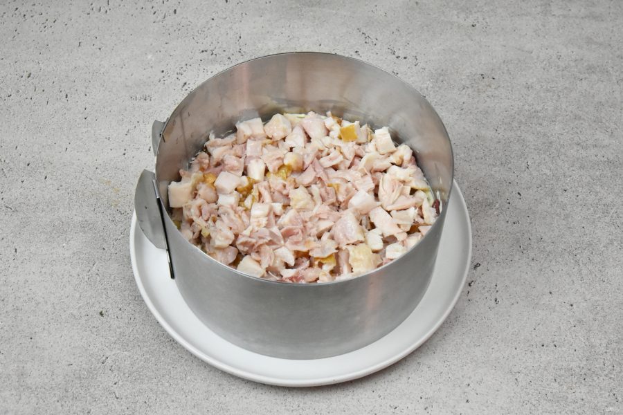 Копченое куриное мясо освободите от кожицы, удалите жир. Срежьте филе с костей и нарежьте кубиком. Старайтесь чтобы все составляющие салата имели одинаковую форму и размер. Подготовьте блюдо для оформления салата. Установите сервировочное кольцо или раздвижное кольцо для выпечки.