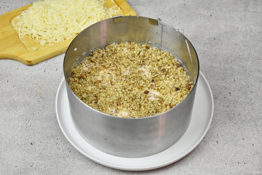На слой майонеза распределите тонким слоем измельченные грецкие орехи и натертый на мелкой терке сыр.