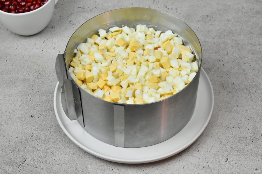 Заключительным слоем салата выложите рубленые яйца, слой майонеза.