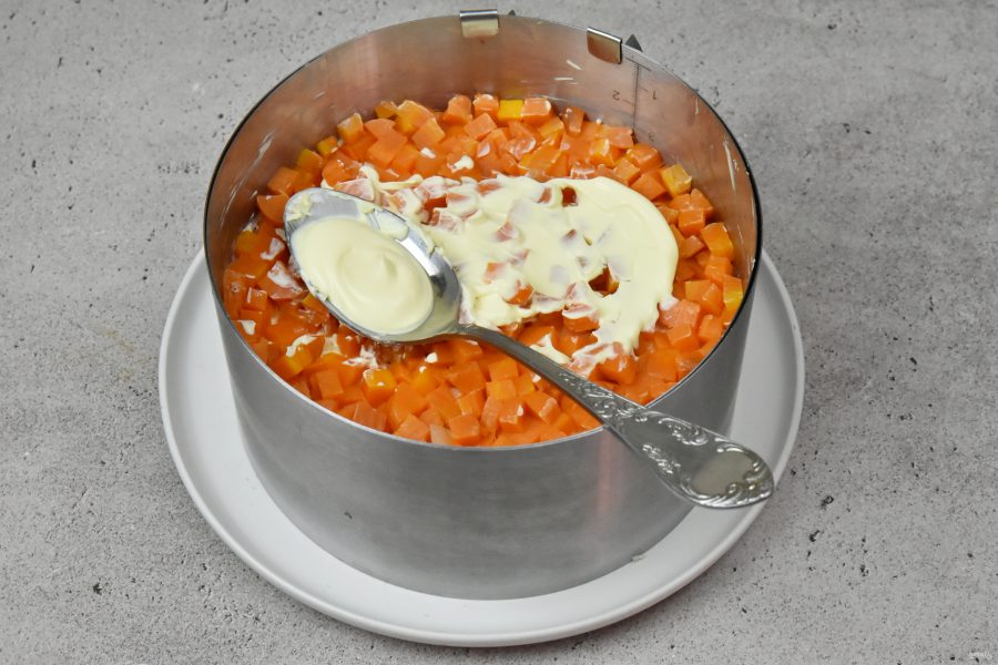 На сыр выложите кубики моркови и снова нанесите тонкий слой соуса.