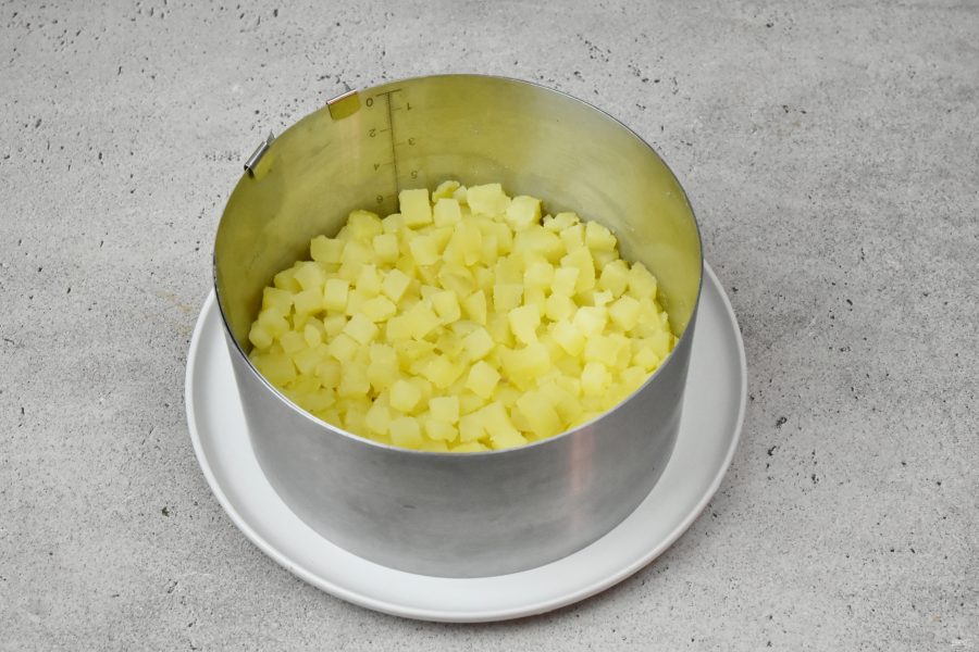 Первым слоем выложите картофельные кубики. При желании картофель можно подсолить и поперчить. Выложите порцию майонеза, распределив равномерно по всему картофельному слою.
