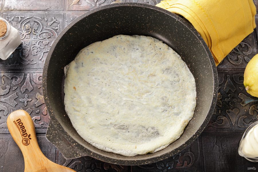 На среднем огне разогрейте сковороду и сбрызните её маслом. Выпекайте яичные блинчики, как обычно, с двух сторон, перевернув один раз. Блины не нужно румянить, как только яичная масса схватится — переворачивайте. Таким образом приготовьте все блинчики.