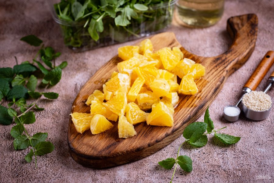 Апельсин почистите от кожуры и нарежьте небольшими кусочками.