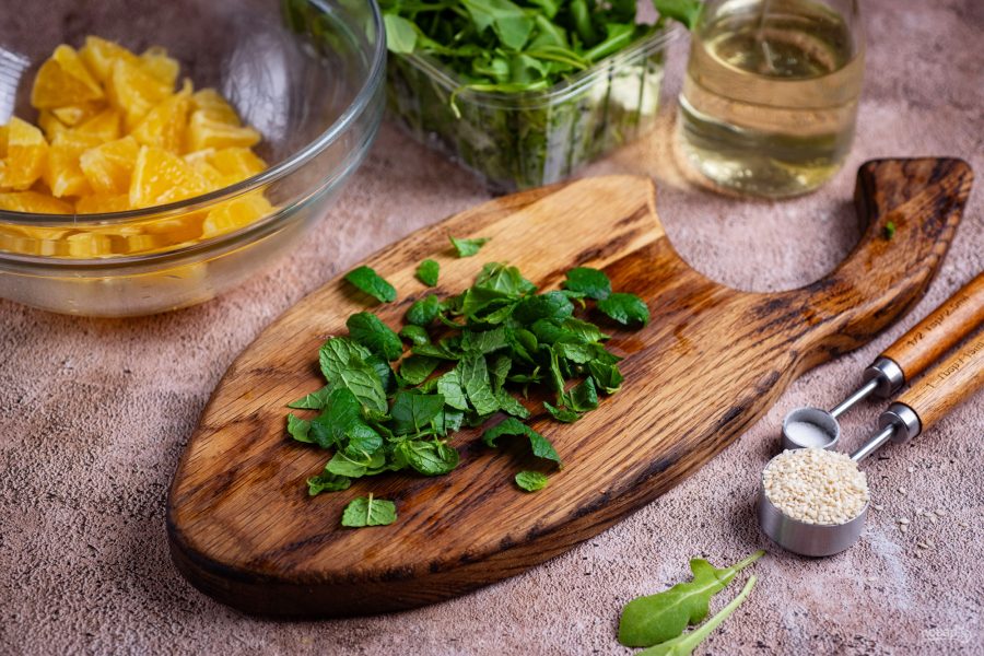 В просторную миску выложите кусочки апельсина, добавьте к ним листики мяты.