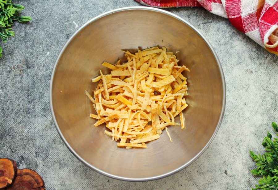 Остывшую куриную грудку порежьте средней соломкой и добавьте к омлету и моркови.