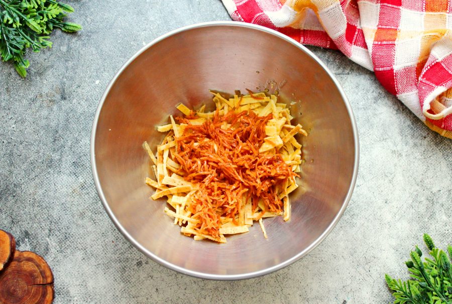 Добавьте в салатник корейскую морковь без жидкости.