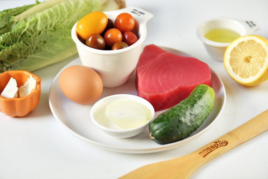 Подготовьте все ингредиенты по списку к рецепту. Тунца при необходимости заранее разморозьте, помойте и вытрите насухо овощи и салат. Также заранее отварите яйцо около 10 минут, остудите в холодной воде.