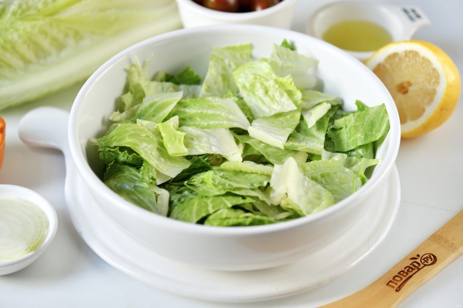 На плоскую тарелку с высокими бортиками выложите листовой салат. Его можно порезать или порвать руками.